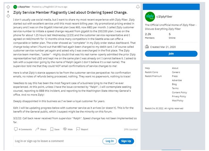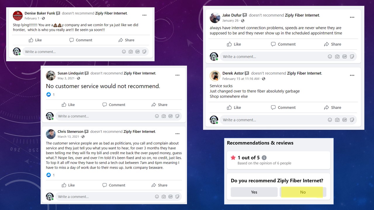 The Customer Service Facebook Page that Ziply has set up for feedback has collected some comments